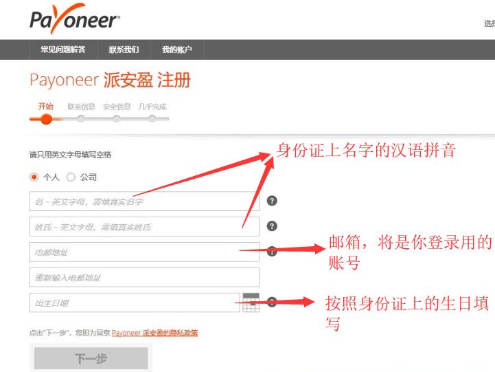 好了,那么废话不多说,Payoneer账户如何注册呢?接下来介绍下个人账户的注册流程,公司账户也是类似的。
