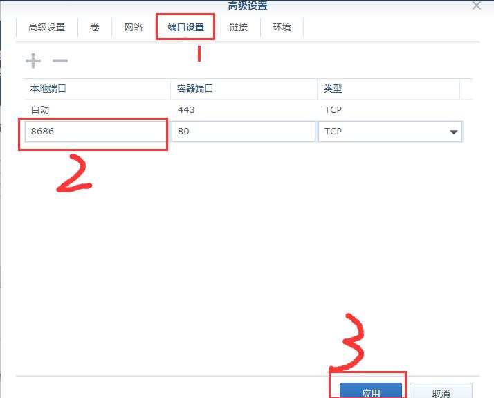 进入高级设置以后,其他都不用改,只修改图上标着2的地方,我改的是8686,可以随意按照自己的需求该,之后就点击应用