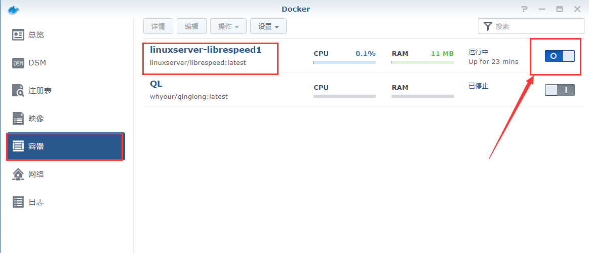 4.来到“容器”,看一下是不是已经正常开启了,没有开启的话就手动点击以下箭头部分