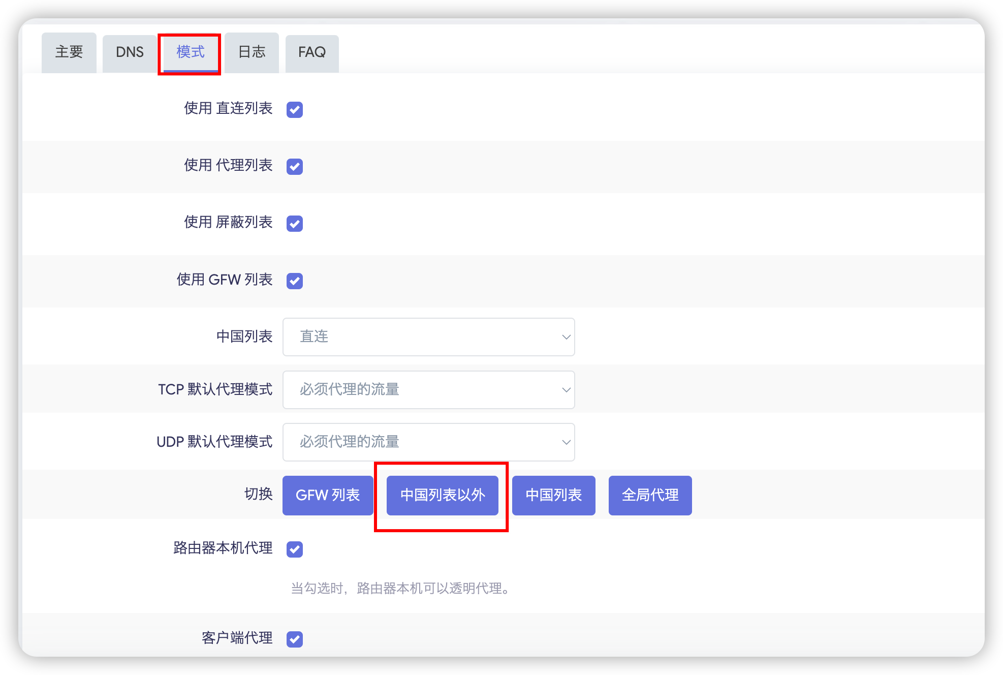 另外有些人喜欢用“中国列表以外”这个模式,请注意设置dns